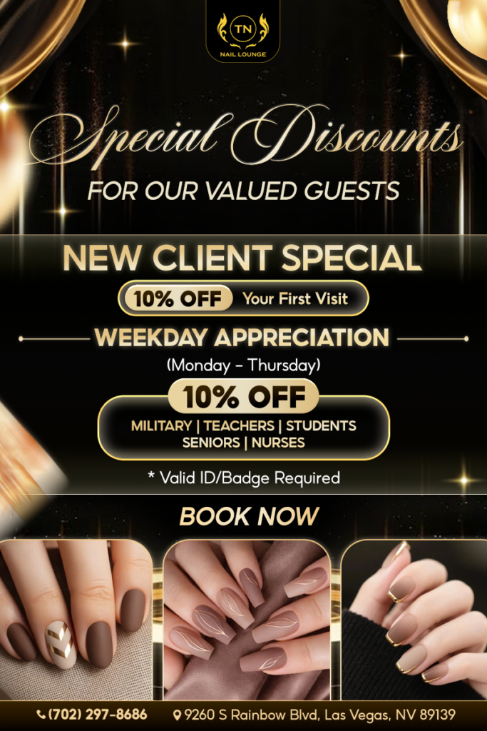 Located at 9260 S Rainbow Blvd, Las Vegas, NV 89139, TN Nail Lounge serves as a premier destination for those who seek a sophisticated blend of technical excellence and genuine relaxation. We believe that meticulous grooming is an essential investment in your personal confidence; therefore, we have cultivated a modern environment where every detail is tailored to provide a seamless, upscale sanctuary. By prioritizing both artistic precision and the comfort of our guests, we ensure that every visit leaves you feeling refreshed and impeccably polished.